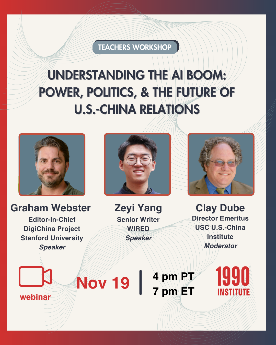 | | - REGISTER FOR “UNDERSTANDING THE AI BOOM: POWER, POLITICS, & THE FUTURE OF U.S.-CHINA RELATIONS” — In today's rapidly evolving world, preparing yourself and the next generation for digital and global citizenship requires critically examining the global forces shaping technology. Whether you’re an educator, industry professional, parent, student, or community member interested in AI and learning about what the future holds, join us to gain a deeper, more nuanced understanding of the AI revolution, with a specific lens on China's role. The final half hour of this webinar will provide context for teachers to educate for tomorrow’s global landscape. Register for “Understanding the AI Boom: Power, Politics, & the Future of U.S.-China Relations” on Wednesday, November 19 at 4 pm PT / 7 pm ET. Our speakers: