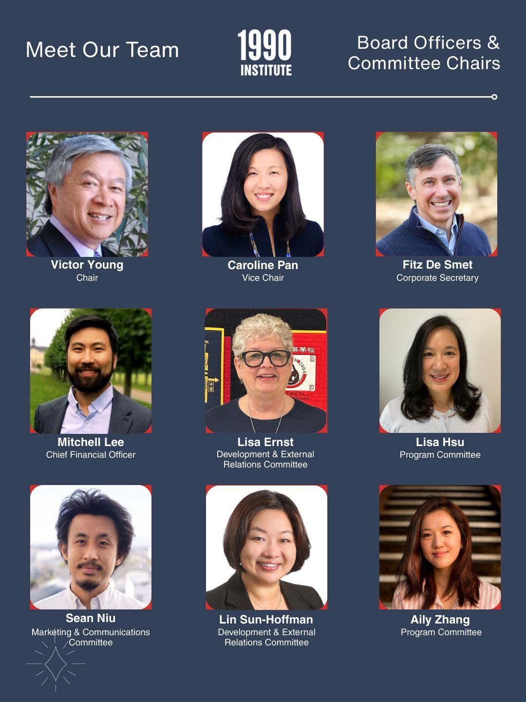 | | | | Dear Friends, We are pleased to introduce the 1990 Institute Leadership team unanimously elected at our annual Board meeting on February 26. Learn more about our team on our website. Our new Board Officers’ experience, insight, and commitment will guide us as we continue to empower Asian American youth, support community engagement, and promote thoughtful U.S.-China dialogue. - Chair — Victor Young
