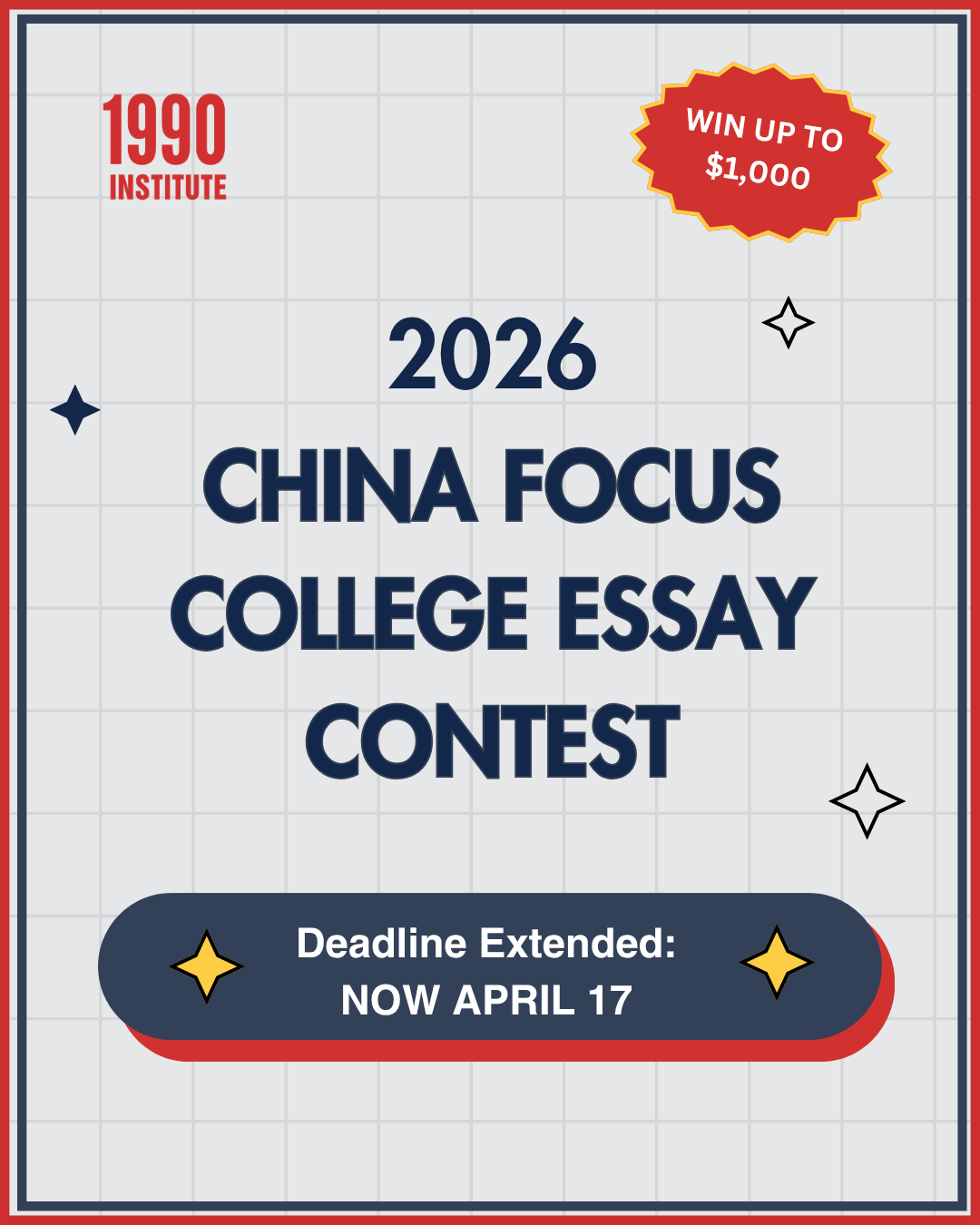 | | The 2026 College Essay Contest is open to college/university students and recent grads. See full rules on our website. This contest is presented by the 1990 Institute, the 21st Century China Center at UC San Diego, the Fudan-UC Center on Contemporary China, and The Carter Center. |